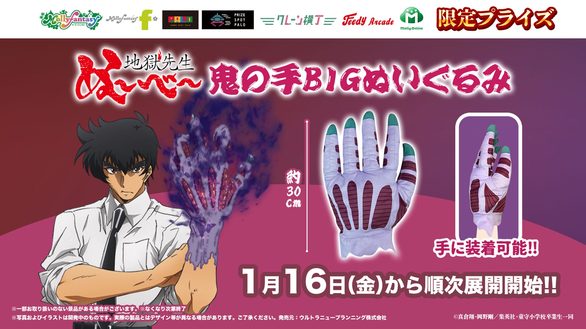 「新アニメ『地獄先生ぬ~べ~』」の限定プライズが登場 装着できる「鬼の手BIG ぬいぐるみ」が1 月16 日(金)よりモーリーファンタジー・PALO にて展開開始