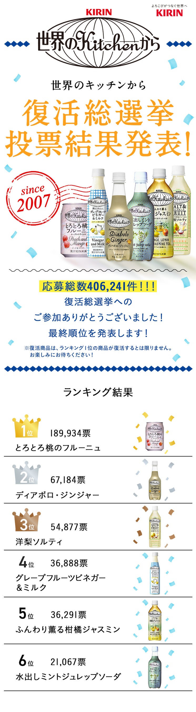 応募総数は406,241票と多くのお客様にご参加いただき、第一位は投票数189,934票を獲得した「キリン 世界のKitchenから とろとろ桃のフルーニュ」が選ばれました。