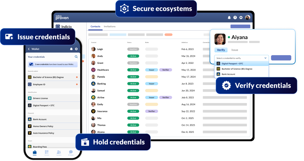 Indicioは、分散型IDおよび検証可能な認証情報(Verifiable Credentials: VC)の発行・管理・検証を安全に行うためのプラットフォーム「Indicio Proven」シリーズを中核とし、個人が自分の認証情報を安全に保管・提示できるウォレットアプリ、そしてサービス開発者が分散型IDを自社アプリに組み込むための開発者向けツール(SDK)など、幅広いソリューションを展開しています。