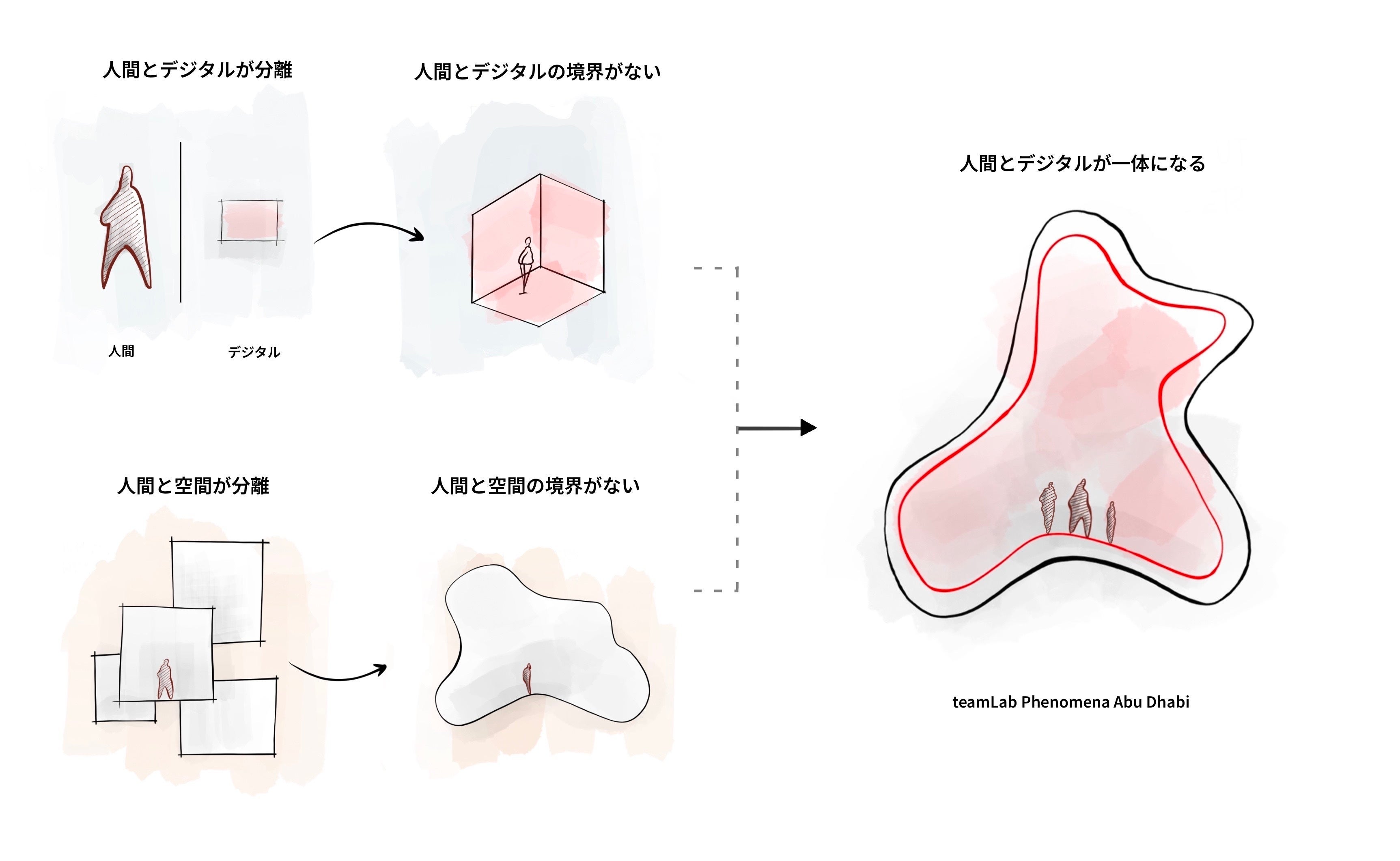 「今回のチームラボフェノメナは、いつも私たちが行う空間作りと逆の順番でつくっていったことが挑戦的でした。まず、自然にある有機的な形状と環境により形状がきまる「環境現象」というコンセプトが設定されました。私たちは人間の行動に基づいて内部空間の設計を開始し、その後、橋から見える海沿いの敷地を選定しました。そして、私たちが内部の作品空間の形状を確定した後、アブダビのMZアーキテクツがファサードを設計しました。通常は、ファサードを決め、内部の壁を決めていくのですが、今回は逆で、自由に内部空間を決めて、その後、外部ファサードを決定しています。そのため、建築の外観には、内部の形状がそのまま現れている部分があることがみてとれます。」
