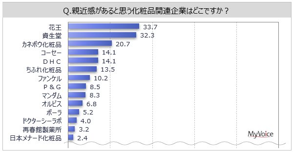 ■『信頼性・安心感』があると思う化粧品関連企業は「資生堂」が5割弱、「花王」「カネボウ化粧品」が各30%台、「コーセー」「ファンケル」「DHC」「ポーラ」が続く。『親近感』は「花王」「資生堂」が各3割強