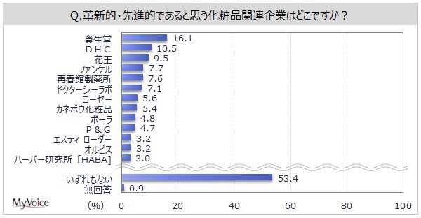 ■『革新的・先進的』であると思う化粧品関連企業は「資生堂」が16%、「DHC」が1割強。「いずれもない」の比率高い