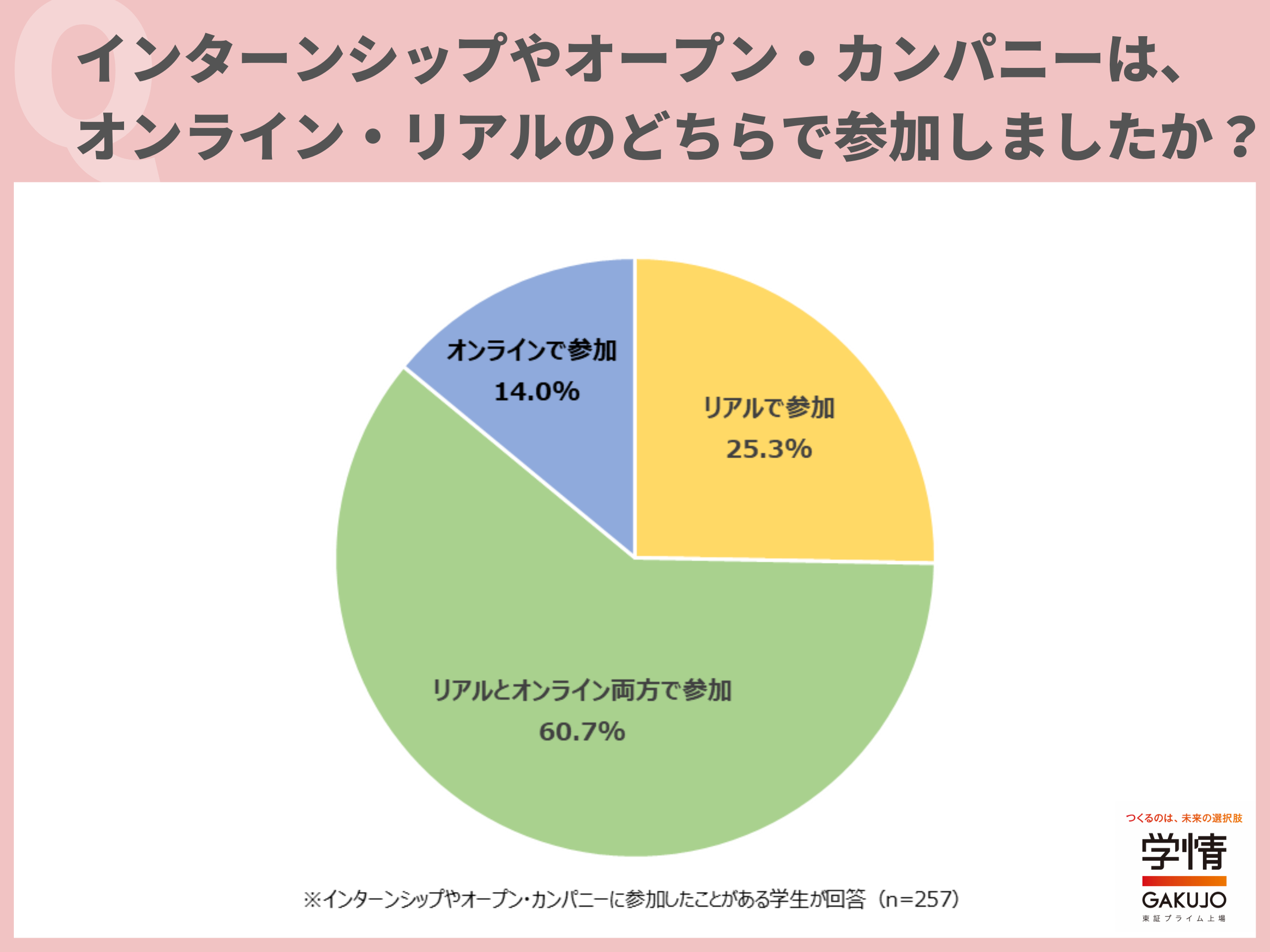 インターンシップやオープン・カンパニーの参加形式について、「リアルとオンライン両方の参加を経験している」と回答した学生が60.7%に上りました。「リアルで参加」25.3%、「オンラインで参加」14.0%となっています。