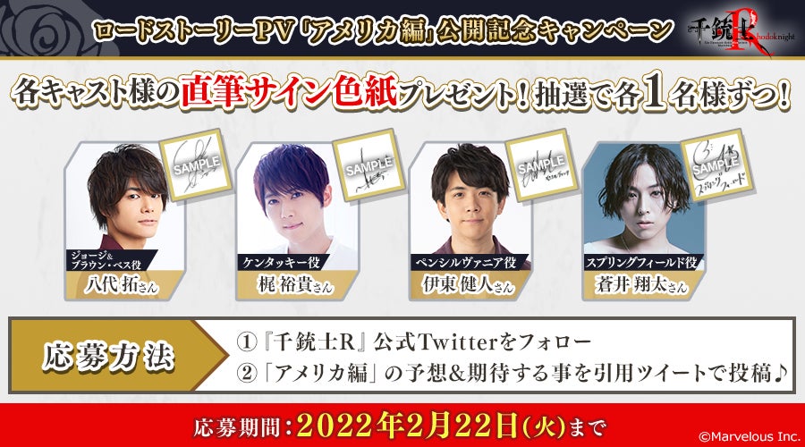 株式会社マーベラス(代表取締役社長 許田周一/所在地:東京都品川区)による、『千銃士』プロジェクトの完全新作スマートフォンゲーム『千銃士:Rhodoknight』(読み:せんじゅうし ろーどないと 以降、『千銃士R』)の新規ストーリーとなるロードストーリー「アメリカ編」の公開が決定しました。ストーリー公開に先んじて、アメリカの貴銃士との出会いを描いた、ロードストーリーPV「アメリカ編」を公開いたしました。また、PV公開を記念して八代拓さん、梶裕貴さん、伊東健人さん、蒼井翔太さんの直筆サイン色紙が当たるプレゼントキャンペーンを開始いたしました。