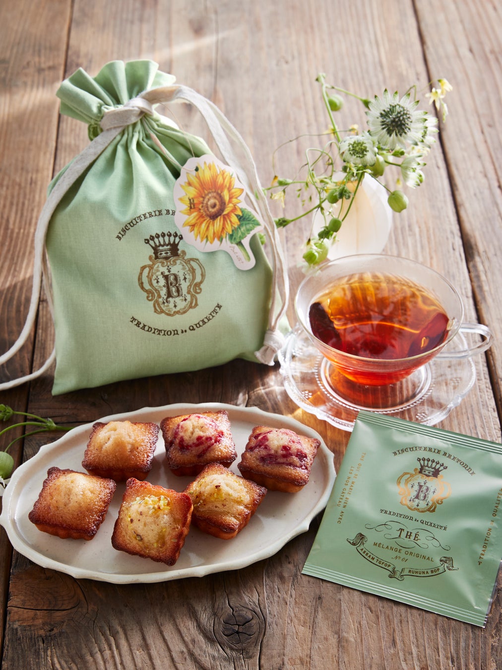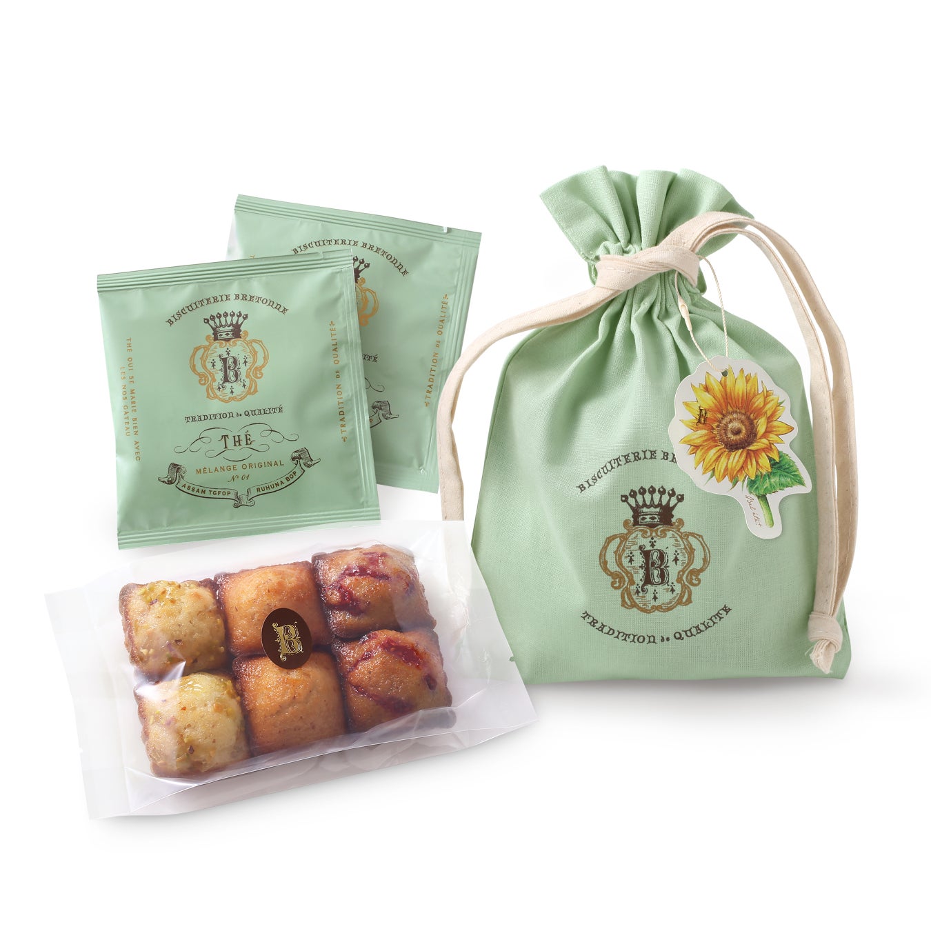 定番人気の〈プレーン〉〈フランボワーズ〉とセットにして、オリジナルブレンド紅茶と一緒に、グリーンのオリジナル巾着に詰め合わせました。ひまわりの カード付きで、夏の贈り物にもぴったりです。爽やかな夏のティータイムをお楽しみください。