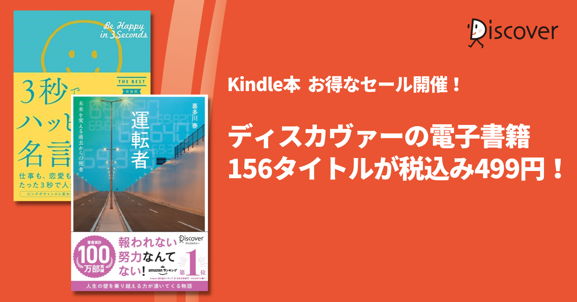 株式会社ディスカヴァー・トゥエンティワン(本社:東京都千代田区、取締役社長:谷口奈緒美)は2023年7月11日から7月17日まで、Kindleにて、ディスカヴァーの電子書籍156点が税込み499円になるセールを開催しています。