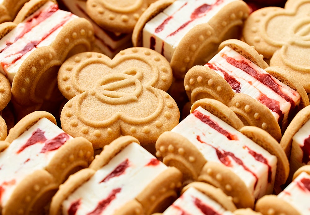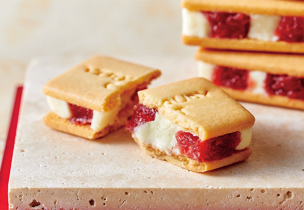 真っ赤な果肉と香り高い甘さが特徴の“イタリア産サブリナ苺”をとろっと煮詰めた苺コンフィチュール。練乳ミルクのコクをなめらかに練り上げたホワイトショコラ。ふたつが柔らかなまま組み合わさった“とろけるダブルメルト製法”が美味しさの決め手です。お口の中で苺とミルクが同時にとろっと溢れる至福の美味しさを、しっとりしたクッキーでサンドしました。