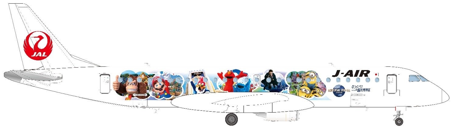 「ドンキーコング・カントリー オープン記念 JAL×ユニバーサル・スタジオ・ジャパン ジェット2」は、2024年12月11日(水)に「スーパー・ニンテンドー・ワールド」に「ドンキーコング・カントリー」をオープンするユニバーサル・スタジオ・ジャパン(以下「USJ」)と、USJのオフィシャルエアラインであるJALグループのコラボレーションにより誕生する特別塗装機です。今回の機体では、ドンキーコングやマリオに加え、ミニオンやセサミストリートの仲間たちなどが描かれています。ぜひこの機会に、感動と興奮に満ちた特別塗装機で全国各地へお出かけください。