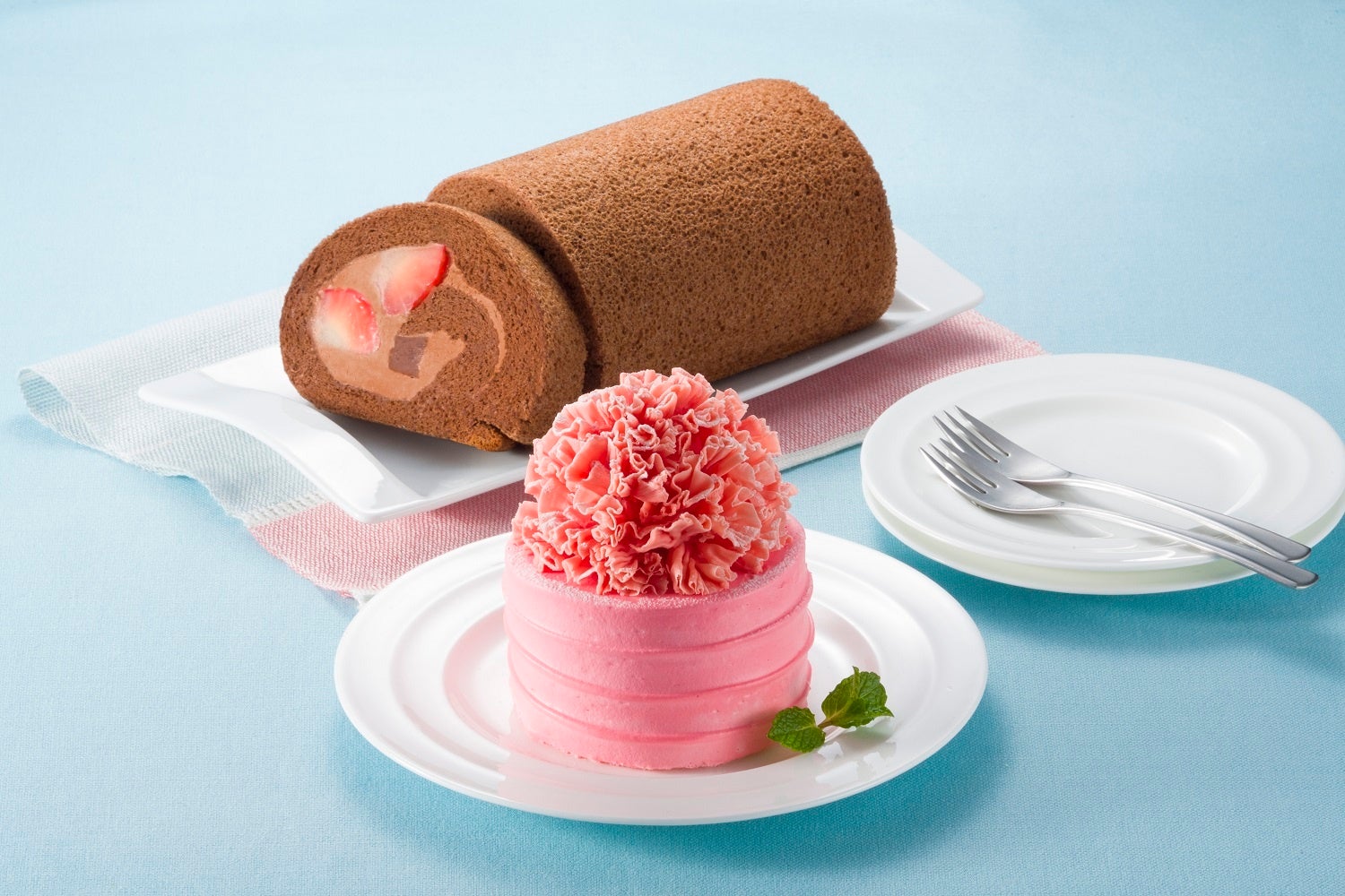 画像奥:スカイベリーのショコラロールケーキ(長さ約16㎝、1本)2,700円