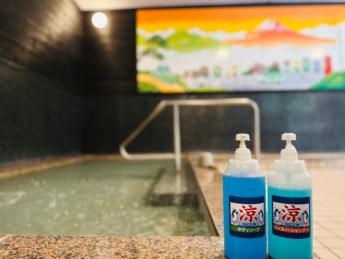 さらに、夏の暑さ対策として、露天風呂では体温と同じぐらいの湯温で体に負担をかけずに長く温泉を楽しめる「不感温浴」を実施中、浴室には爽快感を味わうことができる「クールシャンプー」と「クールボディーソープ」を設置しています。