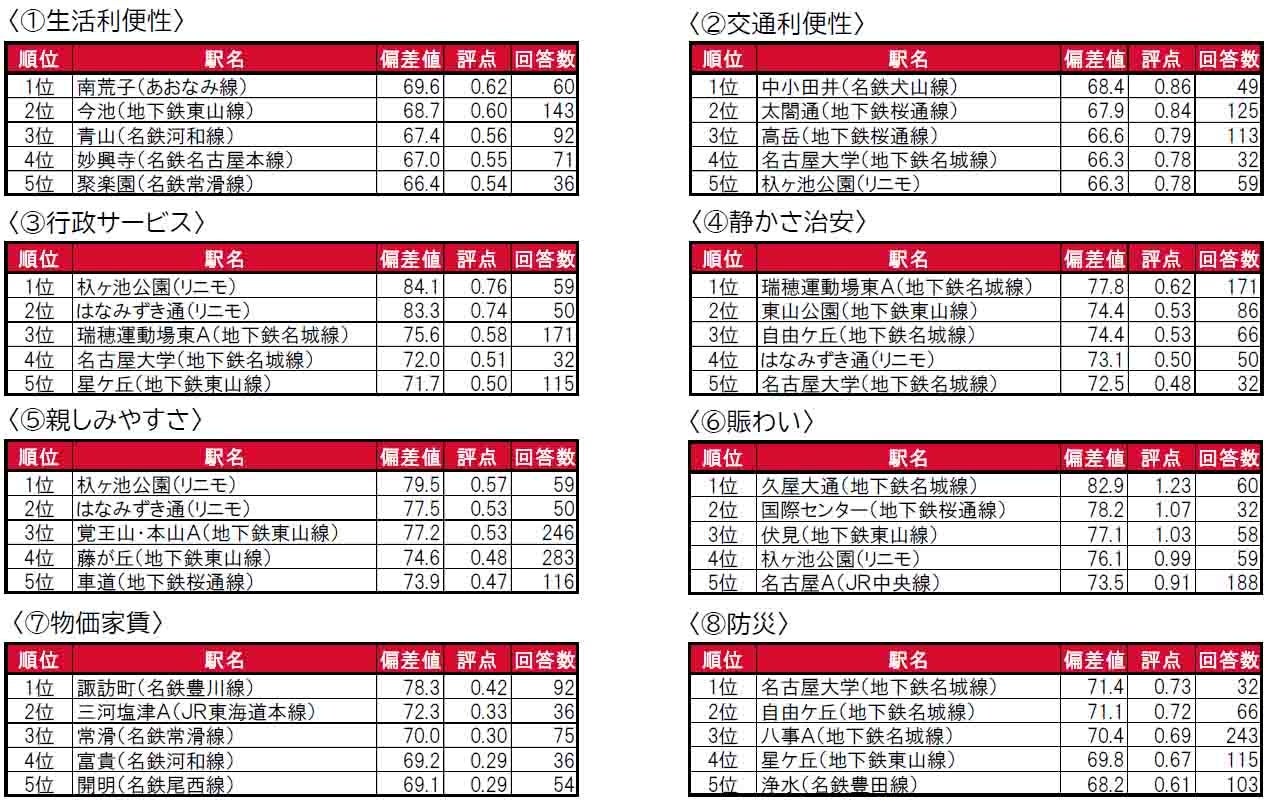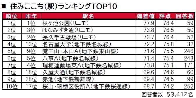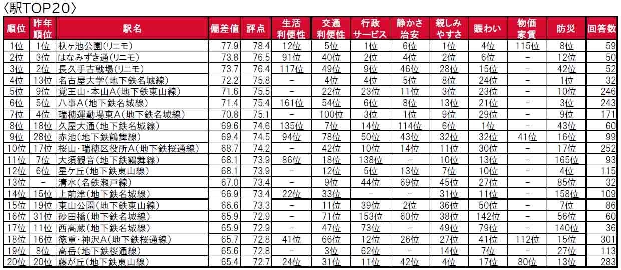 4年連続で、杁ヶ池公園(リニモ)が1位に輝きました。2位ははなみずき通(リニモ)、3位は長久手古戦場(リニモ)で、トップ3は「住みここち(自治体)」で1位の長久手市に位置するリニモ沿線の駅となっています。トップ10内では、4位に名古屋市千種区に位置する名古屋大学(地下鉄名城線)(昨年13位)、8位に名古屋市中区に位置する久屋大通(地下鉄名城線)(昨年18位)、9位に日進市に位置する赤池(地下鉄鶴舞線)(昨年28位)、10位に桜山・瑞穂区役所A(桜山・瑞穂区役所を統合)(昨年17位)が昨年より順位を上げてトップ10入りしています。