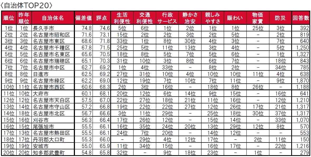 長久手市が、5年連続で1位に輝きました。2位と3位も5年連続で、名古屋市昭和区、名古屋市東区です。トップ10内では、名古屋市西区が昨年11位から一つ順位を上げて10位となっています。トップ10の自治体のうち8つが、名古屋市の行政区です。