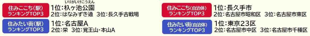 •「住みたい街(駅)ランキング」は、愛知県居住者の2024年の回答を東海エリア内の駅を対象にしてランキングを集計しています。「住みたい街(自治体)ランキング」は、愛知県居住者の2024年の回答を全国の自治体を対象にしてランキングを集計しています。