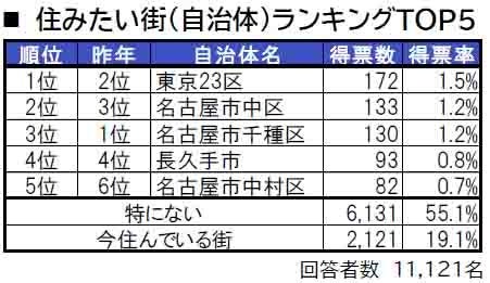 1位は、昨年2位だった東京23区です。2位は名古屋市中区、3位は名古屋市千種区です。4位は、「住みここち(自治体)」で1位の長久手市です。5位は名古屋市中村区で、昨年6位から1つ順位を上げました。