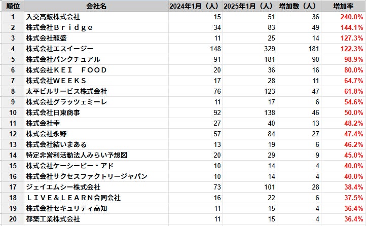 ・2024年1月時点と2025年1月時点の従業員数を比較