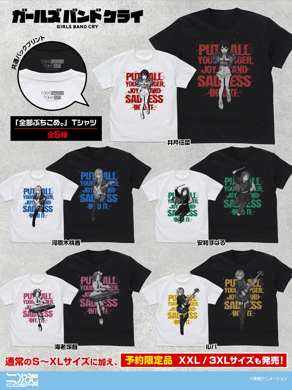 アニメ『ガールズバンドクライ』 仁菜、桃香、すばる、智、ルパ それぞれの「全部ぶちこめ。」 Tシャツは 通常より大きい【XXL/3XL】もコスパ通販ほか実店舗での予約限定でラインナップいたします。