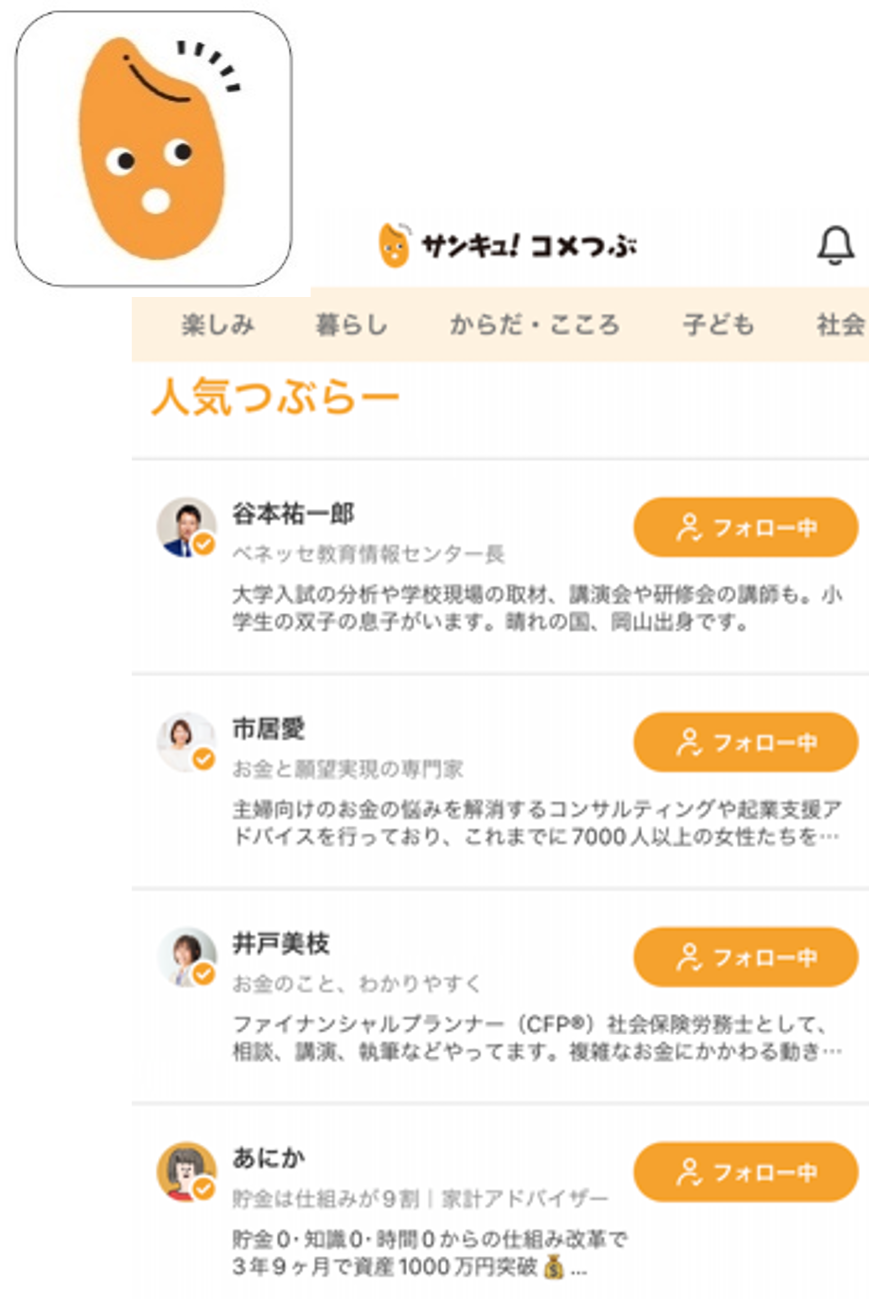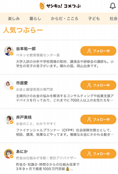 つぶらー例)ファイナンシャルプランナー:井戸美枝さん 節約アドバイザー:丸山晴美さん、脳神経外科医:菅原道仁さん、ベネッセ教育情報センター長:谷本祐一郎さん 等