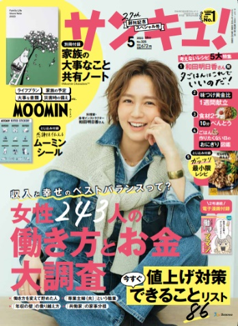 創刊27周年号(5月号)は、表紙に料理家の和田明日香さんをむかえ、仕事とお金、幸せのベストバランスをテーマに大調査しました。仕事と家庭の両立に悩む読者の実話を漫画にした人気連載「ワーママは今日も崖っぷち」の人気エピソードを読者限定電子付録にしているほか、人気のムーミンの家族共有ノートなどで、新年度もマルチタスクに奮闘する女性を応援する記念号になっています。