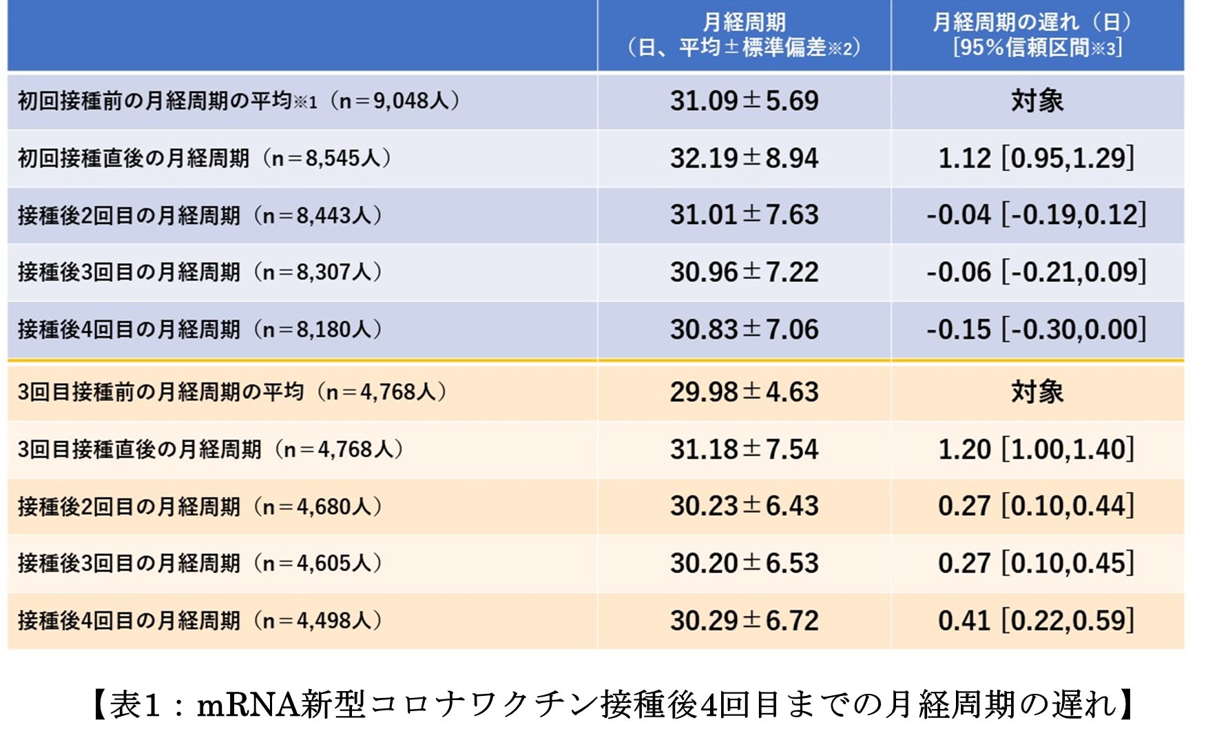 - mRNAの新型コロナワクチン接種直後に、平均して約1日程度の一時的な月経周期の遅れが生じ、その遅れは接種後2~4回目の周期でほぼ正常に戻ることがわかりました(表1)。