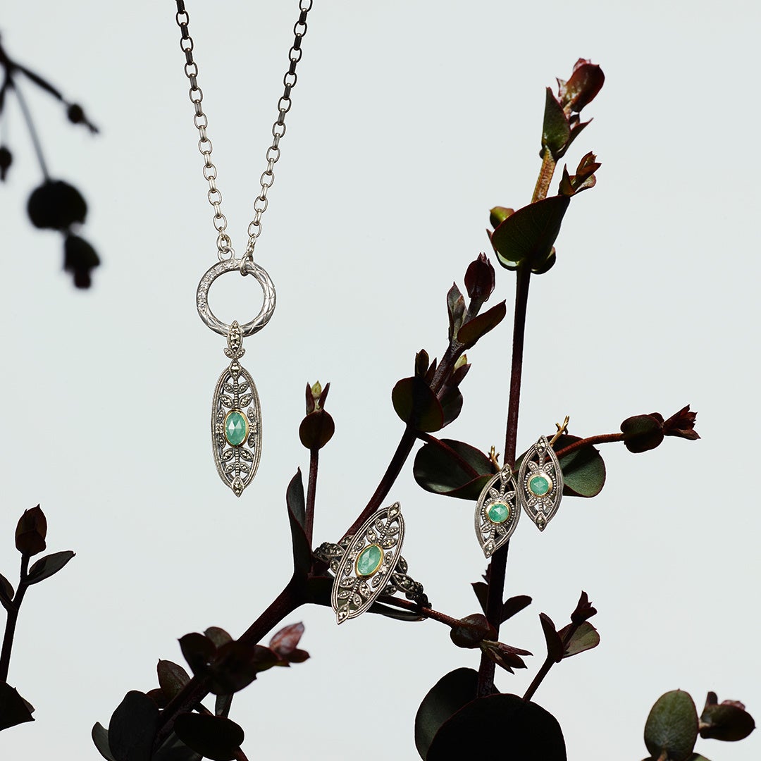 necklace charm 47,300yen/ silver, K10, marcasite, emerald and diamond