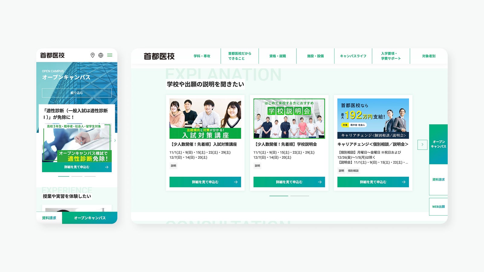 本リニューアルでは、各校のブランドイメージ確立と、資料請求、オープンキャンパス参加の促進を主眼に置き、ウェブサイトの全面的な刷新を実施いたしました。