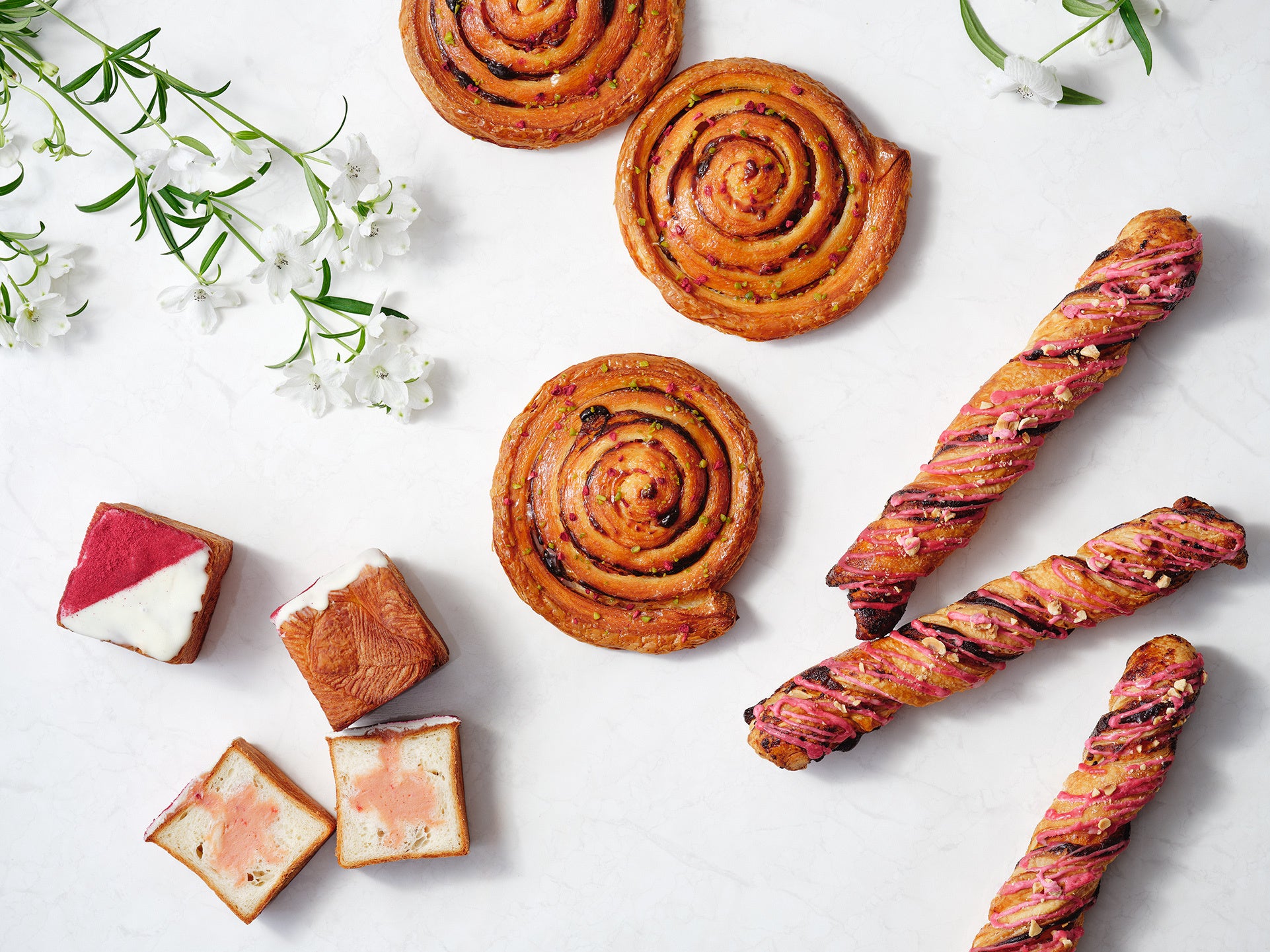 また2月のフェア商品でご好評いただいたキューブシリーズから「RITUEL キューブ・フレーズ」が新たに登場。フランス産発酵バターを使用したキューブ型クロワッサンにイチゴのカスタードクリームを包み、焼き上げました。仕上げにホワイトチョコレートとヴィヴィッドなフランボワーズパウダーをアクセントにトッピングし、アーティスティックな一品に仕上げました。その他、昨年人気「サクリスタン・フランボワーズ」のリバイバルなど、様々なベリーのフレーバーとともに楽しむ、春のヴィエノワズリーが揃います。
