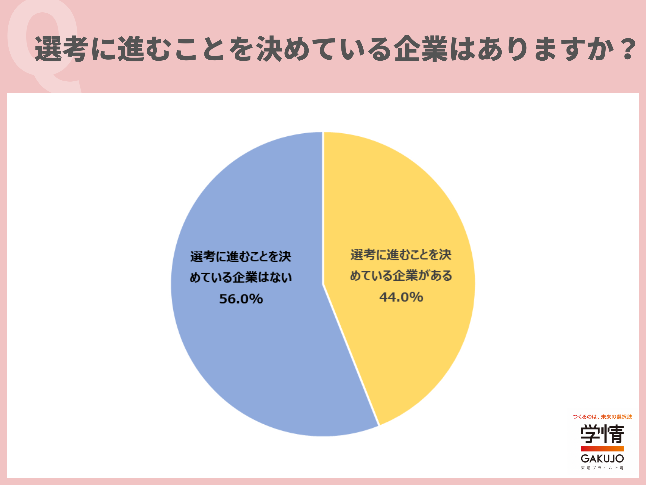 「選考に進むことを決めている企業がある」と回答した学生が、44.0%に上りました。4割以上の学生が、3年生の9月末時点で「選考参加」を決めている企業があることが分かります。「インターンシップに参加し、企業の雰囲気を知ることができた」「複数の就業体験に参加し、どのような仕事が向いているか分かってきた」「インターンシップに参加した企業の中から、選考に参加する企業を決めたい」「選考に参加したい企業を決めて、年内には就職活動を終わらせたい」などの声が上がりました。