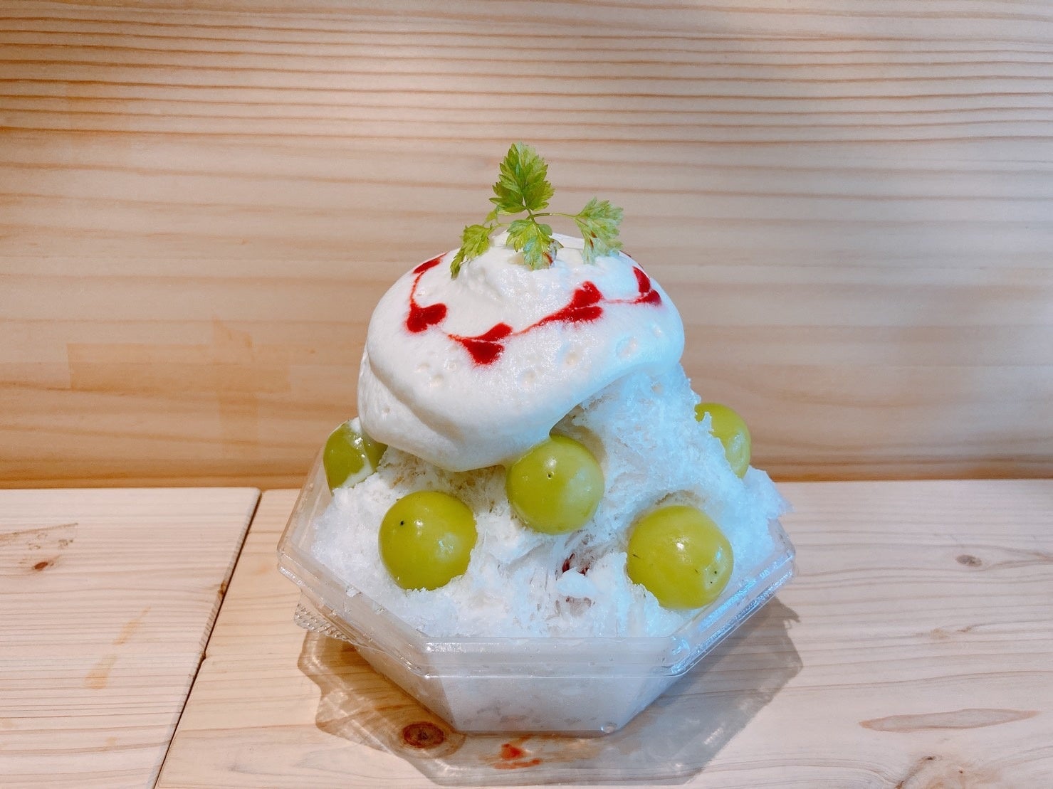 ぜいたくに使ったシャインマスカットがまるで宝石のよう。 かき氷のためだけに作り出された、甘さ・ふんわり感が絶妙のエスプーマに、シャインマスカットの華やかな香りが広がる至福のひとときを。