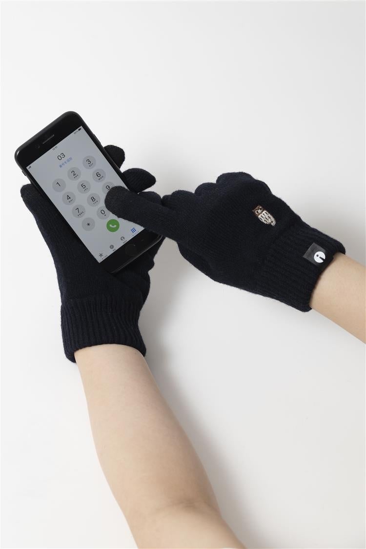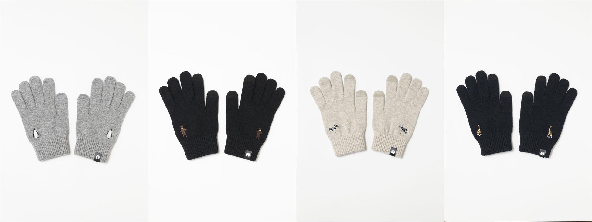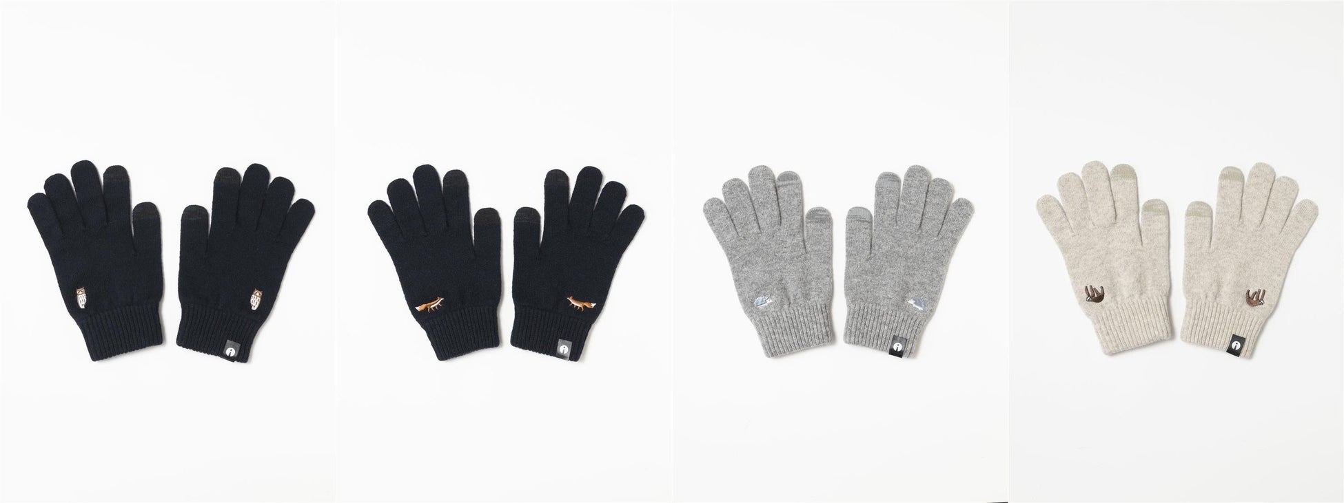 リサイクルウールを使用。親指と人差し指の指先がタッチパネル対応となっており、手袋をしたまま操作できる。ハリネズミやキツネなどワンポイントの刺繍入り。全8種。