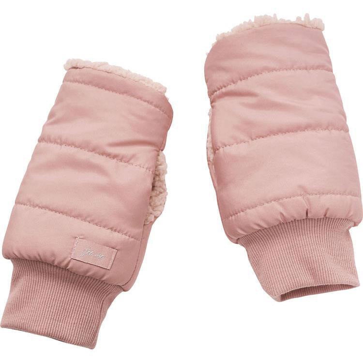 もこもこ素材の手袋と、使いやすい差し込みタイプのマフラー。パイピングをあしらったカジュアルなデザイン。