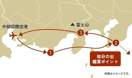 中部国際空港発(5:40頃) → 遠州海岸沿い上空通過 → 南房総上空(初日の出 鑑賞ポイント) → 西へ旋回 → 中部国際空港着(7:45頃)