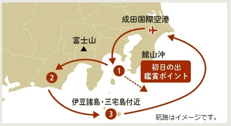 成田国際空港発(5:35頃)→ 館山沖上空(初日の出 鑑賞ポイント)→ 伊豆諸島上空 → 成田国際空港着(8:00頃)