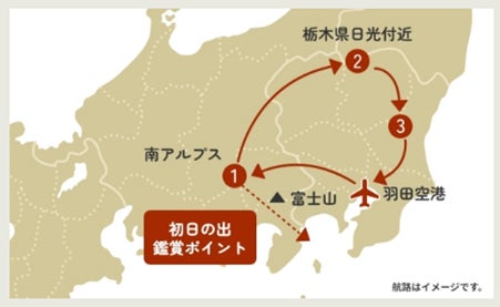 羽田空港発(5:45頃)→ 南アルプス(初日の出 鑑賞ポイント)→ 栃木県日光上空 → 羽田空港着(8:00頃)