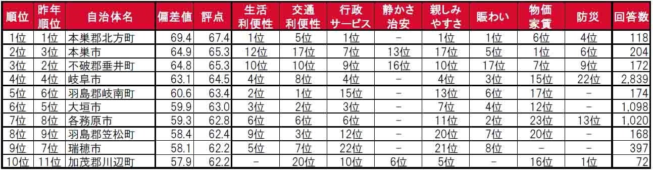 街の住みここちランキング2024<岐阜県版>自治体TOP10 因子別順位
