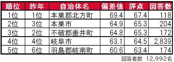 住みここち1位は5年連続で本巣郡北方町。2位本巣市、3位は不破郡垂井町。