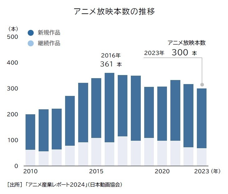 日本動画協会によると、2023年のTVアニメタイトル数は300本だった。ピークの2016年(361本)に比べると61本減・8割台の水準にとどまり、過去10年で最少だった。近時は、アニメ放映の媒体がテレビからYouTubeやTikTokを中心としたショートアニメ、Netflixなど配信プラットフォーム上に移行し、相対的にテレビ放映の重要性が低下している。アニメ市場をみると、2023年における動画配信サービス(VOD)など「アニメ配信市場」が前年比51.4%増の2501億円を記録し、単年市場として初めて2000億円を突破し過去最高となった。また、キャラクターなどアニメ商品化市場も前年比4.7%増の7008億円と、過去最高を更新した。