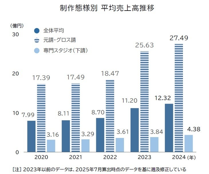 2024年の制作会社1社当たり平均売上(収入)高は12億3200万円だった。コロナ禍による制作遅延などを背景に一旦は減少に転じたものの、2021年以降4年連続で増加し、集計可能な2000年以降で最高を更新した。「元請・グロス請」で増加が顕著な一方、下請となる「専門スタジオ」では小幅の伸びにとどまるなど制作態様によって格差もあるものの、全体では売上高の増加傾向が続いた。