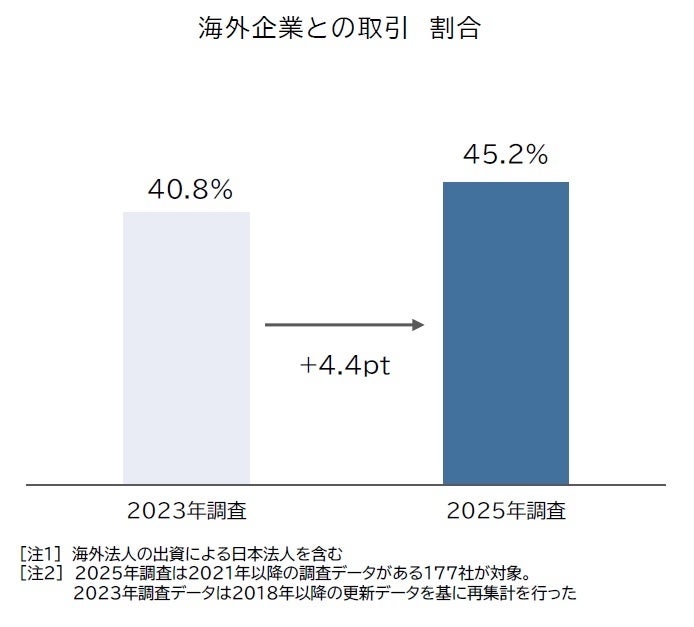 アニメ制作会社のうち、2021年以降(過去5年以内)に取引状況などの調査データがある177社を分析した結果、外注や制作請負、作品提供などで海外企業との取引が判明した企業の割合は45.2%を占めた(2025年7月時点)。同一条件下で集計した2023年時点(40.8%)と比較すると4.4pt増加した。