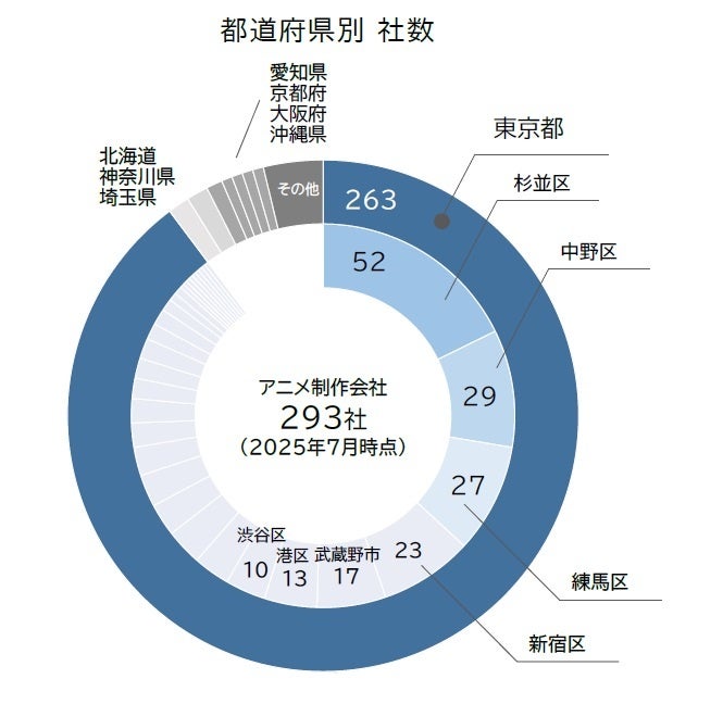 293社のうち、本社所在地が最も多い都道府県は「東京都」(263社)となり、全体の9割を占めた。都内で最も多い地域は「杉並区」(52社)で、「中野区」(29社)、「練馬区」(27社)と続いた。都下では「武蔵野市」(17社)などで多い。新宿や渋谷など都心に制作拠点を設ける制作会社も目立つほか、近年はCG関連企業を中心に「港区」(13社)も目立つ。