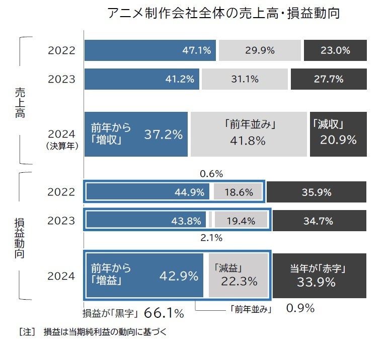 一方で、アニメ作品の供給増に伴い業界全体でアニメーターなどのマンパワー不足がより顕在化したことで制作期間が想定以上に延びた結果、コストが収入を大きく上回る逆ザヤを計上するケースが前年に比べて目立った。制作スケジュールを正常化するため、フリーランスのアニメーターや原画・動画専門スタジオに外注する本数も増えたものの、下請制作でも同様に人材不足で受注可能な事業者が限定的であり、外注コストが高騰した。また、制作工程の内製化比率を高めることで収益力改善を目指し、アニメーターの自社雇用が進んだ結果、人件費や増床による賃借料の増加など維持管理コストも膨張し、コスト増のペースが売上高の増加率を大きく上回る形で「減益」「赤字」となる制作会社が多かった。