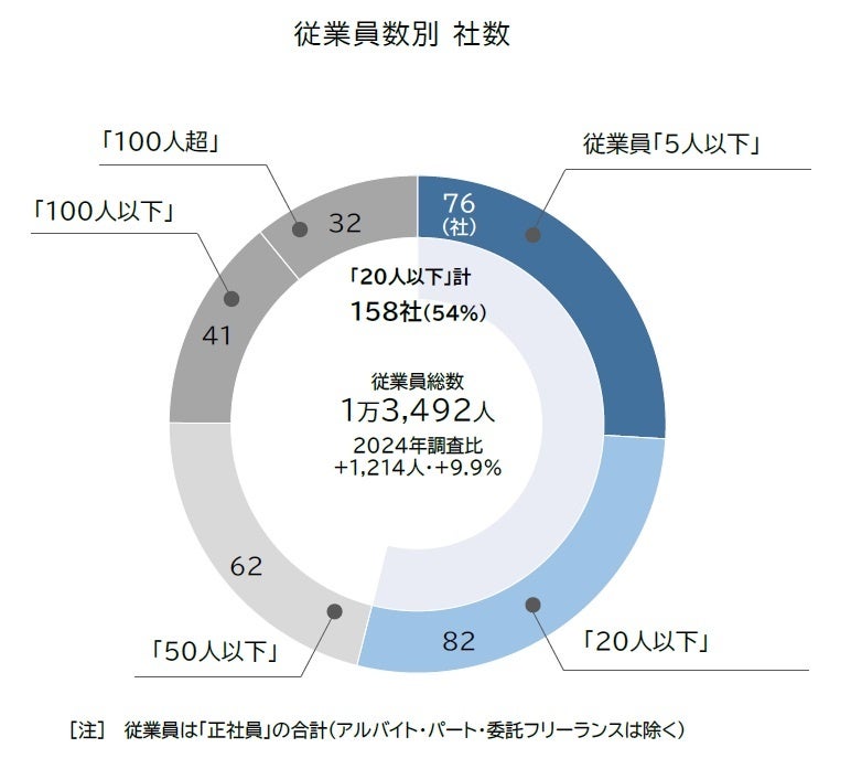 従業員規模では、最も多かったのは「20人以下」(82社)で、「5人以下」(76社)を上回った。従業員20人以下の企業が占める割合は54%と、全体の6割を占めた前年から大幅に低下した。なお、2025年7月調査時点のアニメ制作業における従業員総数は1万3492人(前年比+1214人・+9.9%)。