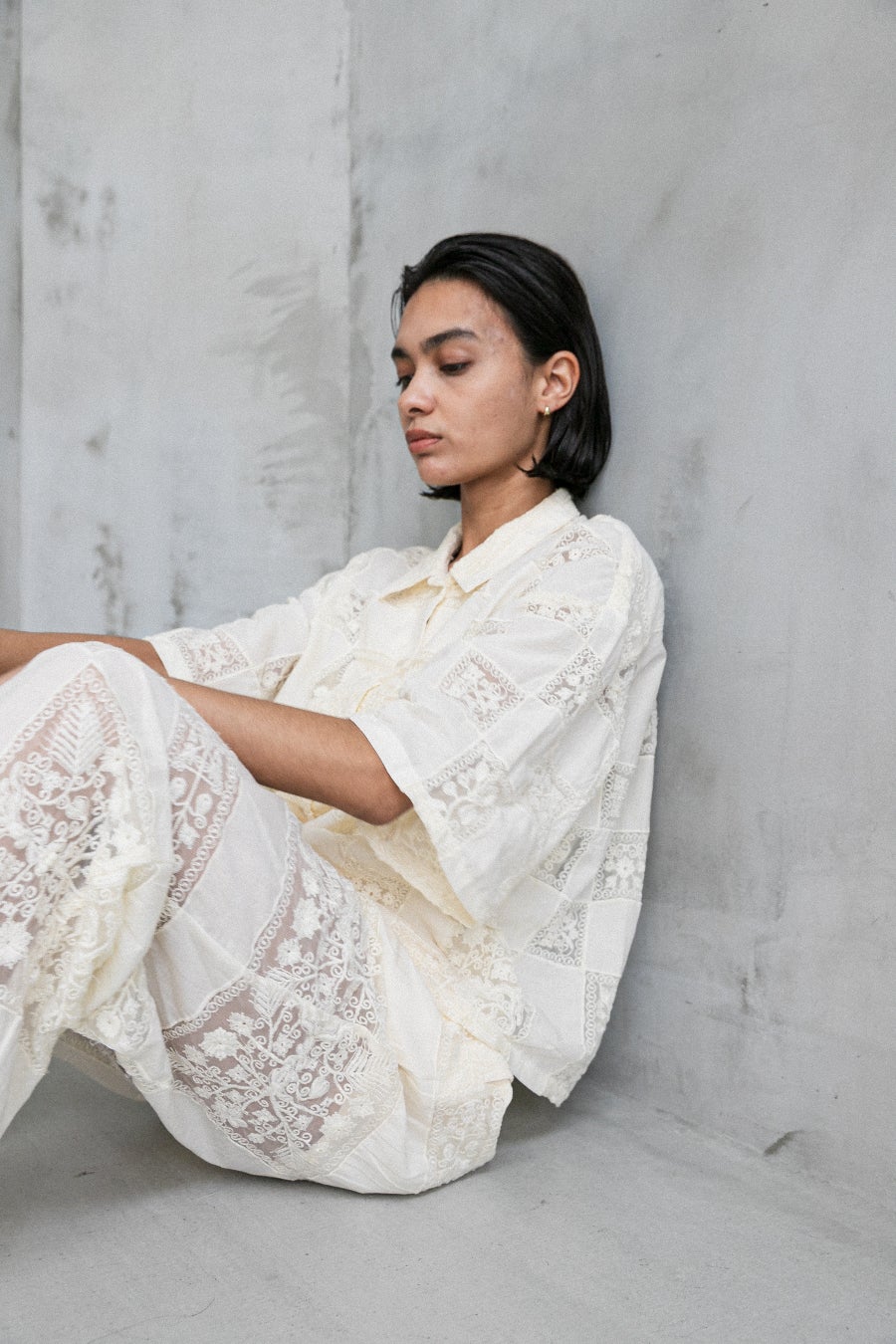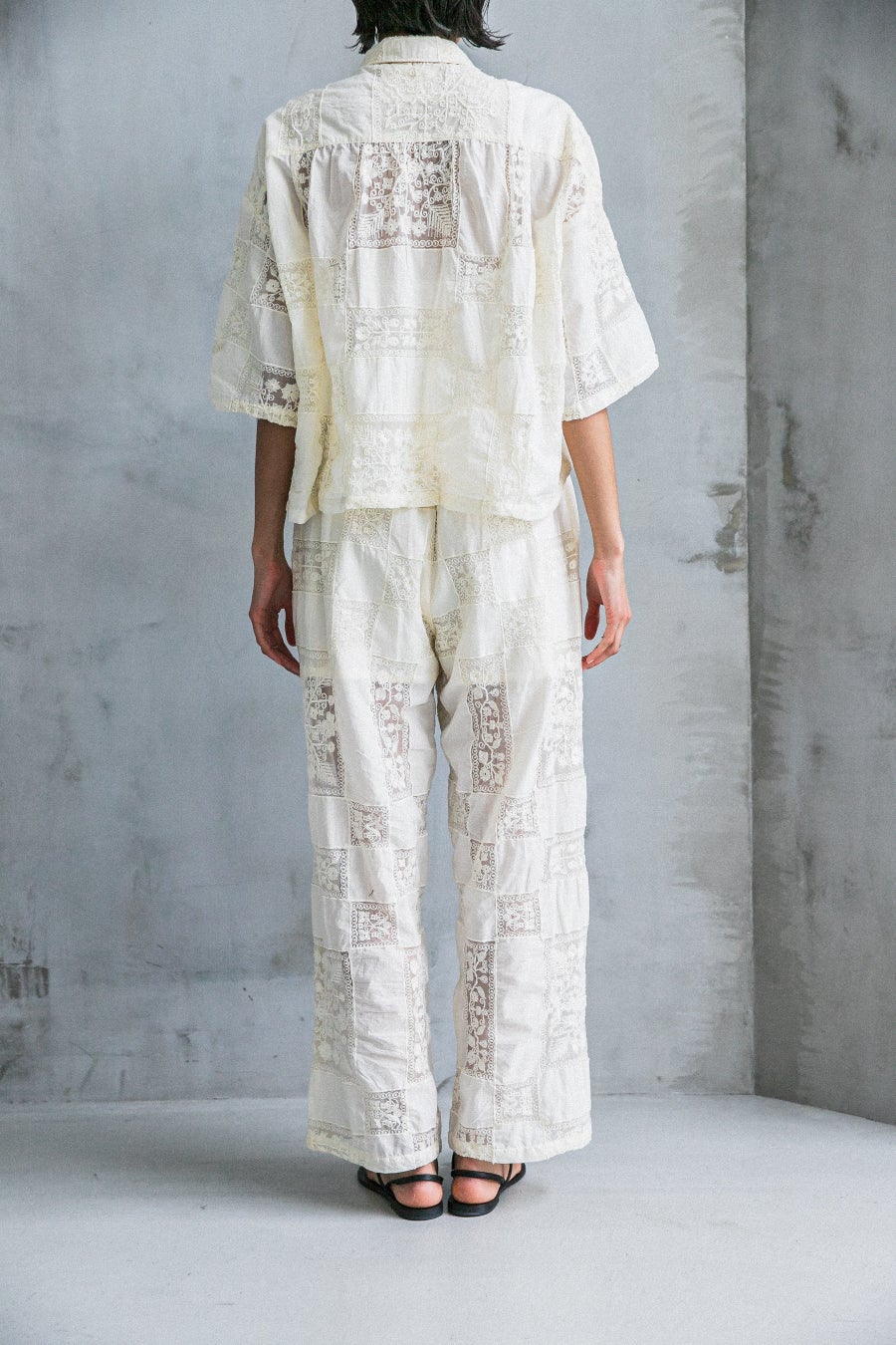 第二弾の別注はcrinkle crinkle crinkleのシグネチャーアイテムでもあるレースを使用したセットアップ。今シーズンのインラインでは展開のなかったオフホワイトを特別にオーダーいたしました。