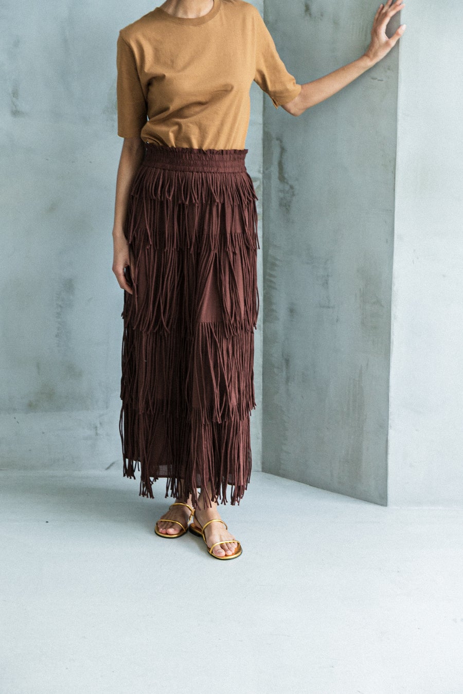別注第一弾はブランド創立初期に販売していたアーカイブスカートを復刻させた、フリンジティアードスカート。本体と同素材のコットン生地をバイアスにカットし、1本1本を手作業で紐にしフリンジを作ったインドならではの技術がなせるアイテムです。存在感のある1着でシンプルなTシャツなどと合わせてもおしゃれなスタイリングに仕上がります。