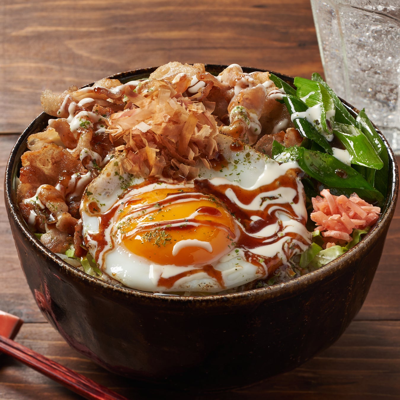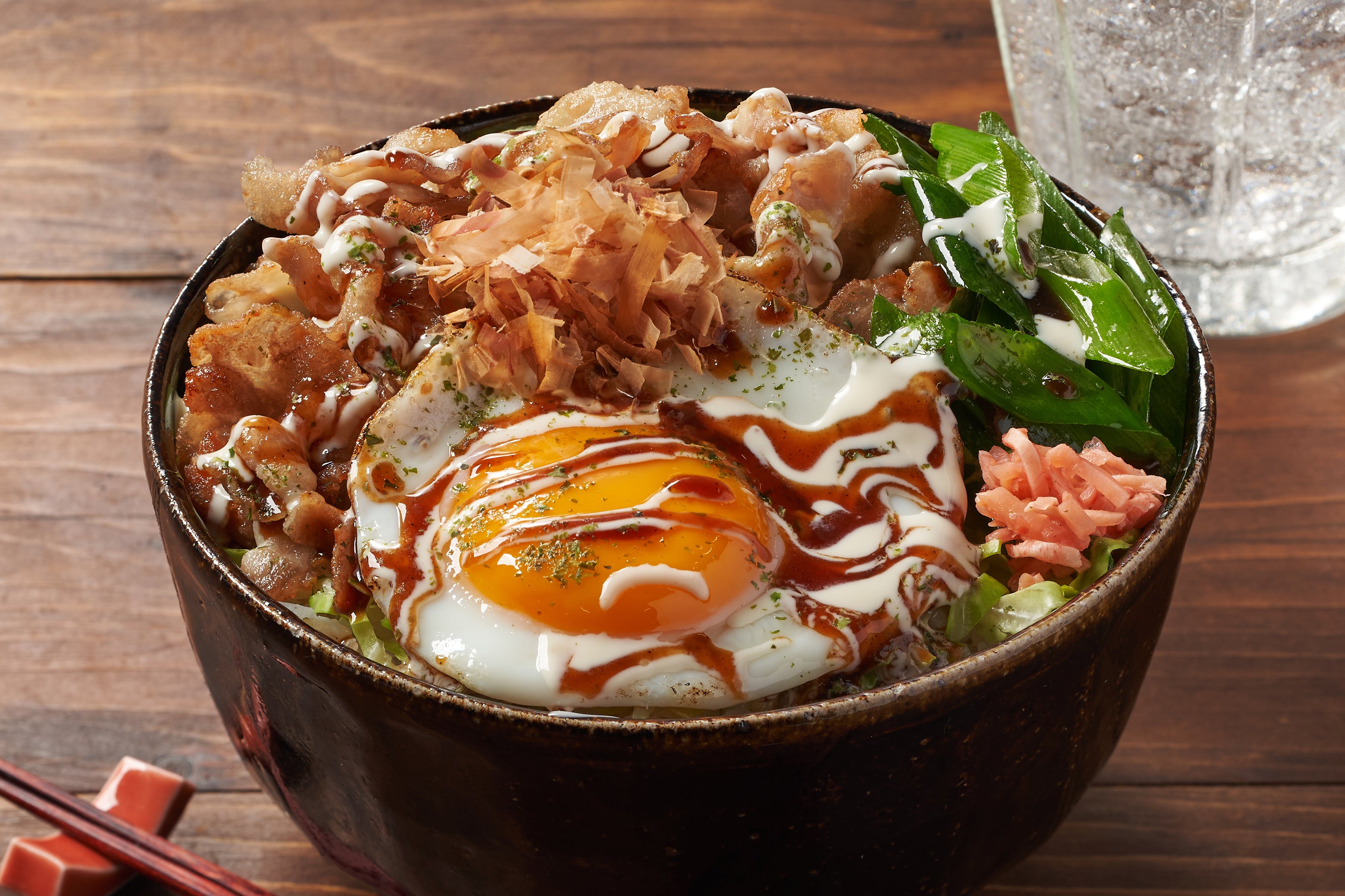 大阪のご当地丼は、お好み焼き丼!カリッと焼いた豚バラ肉と、豚の脂で香ばしく焼いた九条ねぎがポイントです。トロッとした目玉焼きとソースにマヨネーズ、大阪ならではの味をからめながらお召し上がりください。