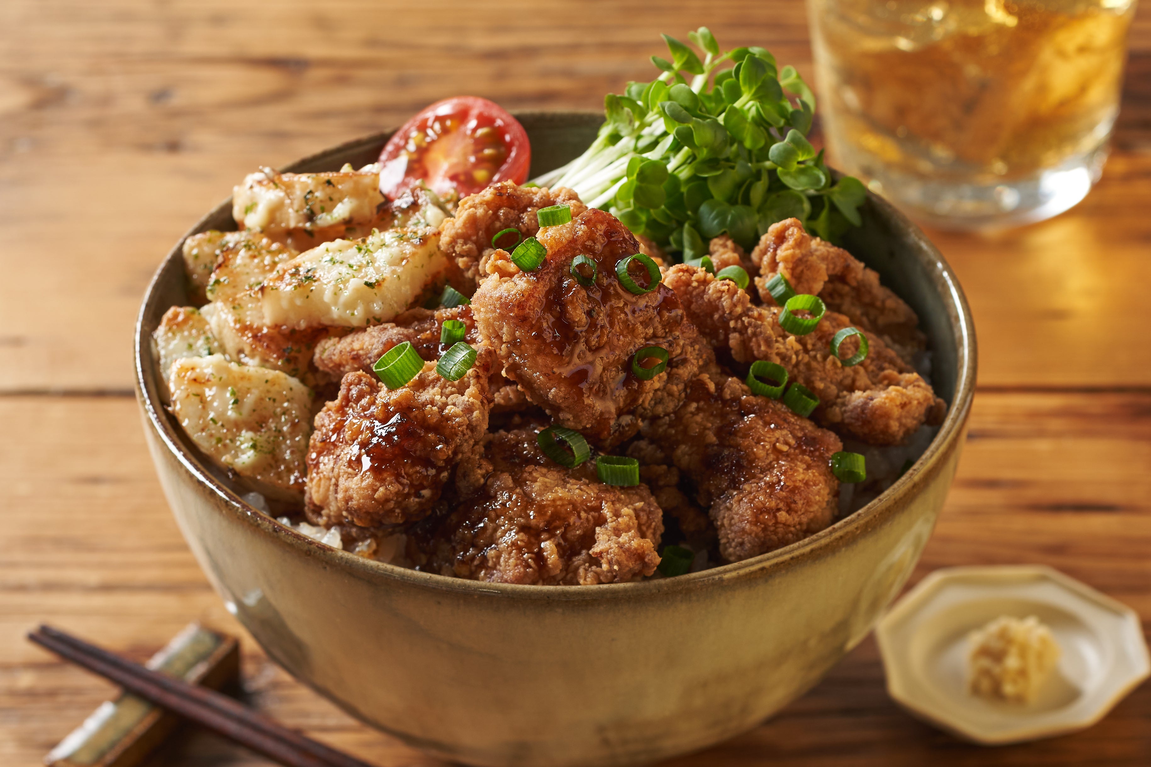 北海道釧路のB級グルメ、たれザンギを丼に仕立てました。にんにくとしょうがの効いた甘じょっぱいたれがから揚げにからみ、濃厚な味付けでごはんがすすみます。ほんのり和な味わいの長いものあおさマヨ和えを一緒に盛ってお召し上がりください。