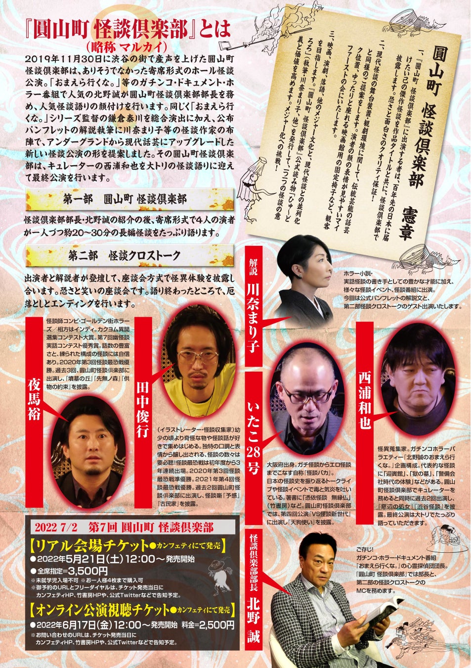 2019年11月30日に渋谷の街で産声を上げた圓山町 怪談倶楽部(通称 マルカイ)は、ありそうでなかった寄席形式のホール怪談公演。「おまえら行くな。」等のガチンコ・ドキュメント・ホラー番組で人気の北野誠が圓山町怪談倶楽部部長を務め、人気怪談語りの顔付けを行いました。同じく「おまえら行くな。」シリーズ監督の鎌倉泰川を総合演出に加え、公式パンフレットの解説執筆に川奈まり子等の怪談作家の布陣で、アンダーグランドから現代話芸にアップグレードした新しい怪談公演の形を提案して参りました。