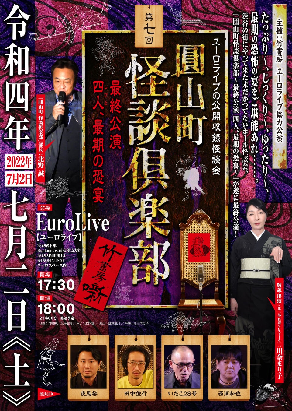竹書房 主催、最大・最恐・最期のマルカイ『第7回圓山町怪談俱楽部~最終公演 四人(しびと)、最期の恐宴~』が2022年7月2日(土) にユーロライブ(東京都渋谷区)にて開催されます。チケットはカンフェティ(運営:ロングランプランニング株式会社、東京都新宿区、代表取締役:榑松 大剛)にて5月21日(土)12:00より発売開始です。
