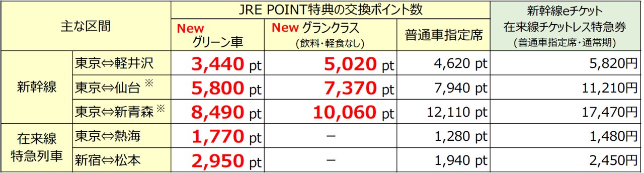 JRE POINT特典で、グリーン車・グランクラス・プレミアムグリーンが利用可能になります。
