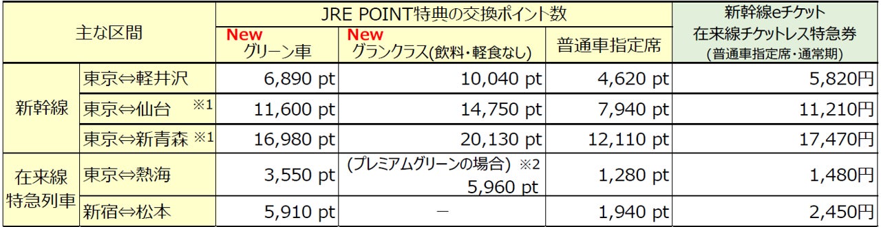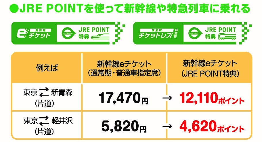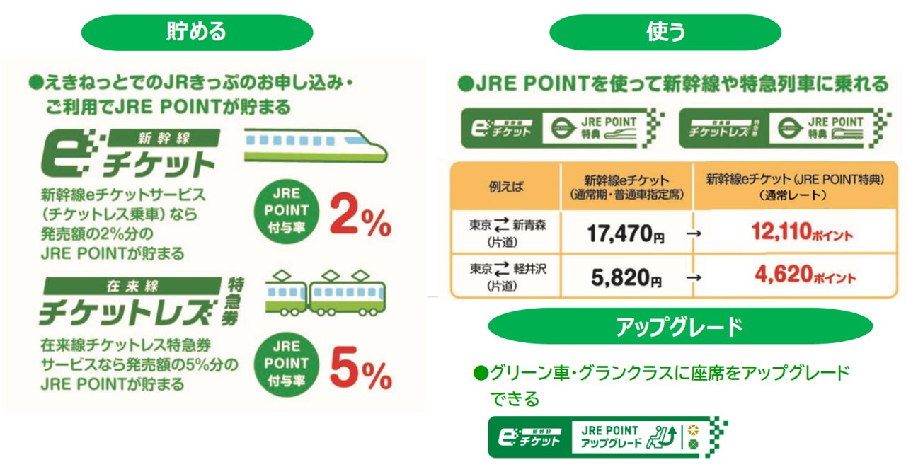 貯まったポイントはJR東日本の新幹線・特急列車にご乗車できる「新幹線eチケット(JRE POINT特典)」「在来線チケットレス特急券(JRE POINT特典)」に交換できるほか、普通車指定席用の「新幹線eチケット(基本)」からグリーン車やグランクラスに座席をアップグレードできる「新幹線eチケット(JRE POINTアップグレード)」をご利用いただけます。