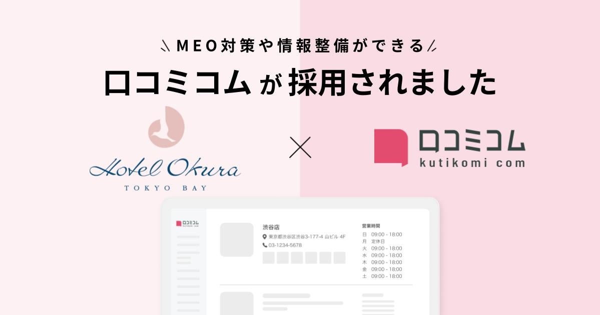 株式会社mov(代表取締役:渡邊 誠、本社:東京都渋谷区)が提供する、店舗・施設向け集客一元化プラットフォーム「口コミコム」が、株式会社ホテルオークラ東京ベイ(代表取締役社長:美濃地 誠、本社:千葉県浦安市)において採用されたことをお知らせいたします。今回の導入により、MEO対策・インバウンド対応を強化し、施設ごとの集客施策を効率的に展開することで、国内外の宿泊客数拡大を目指します。